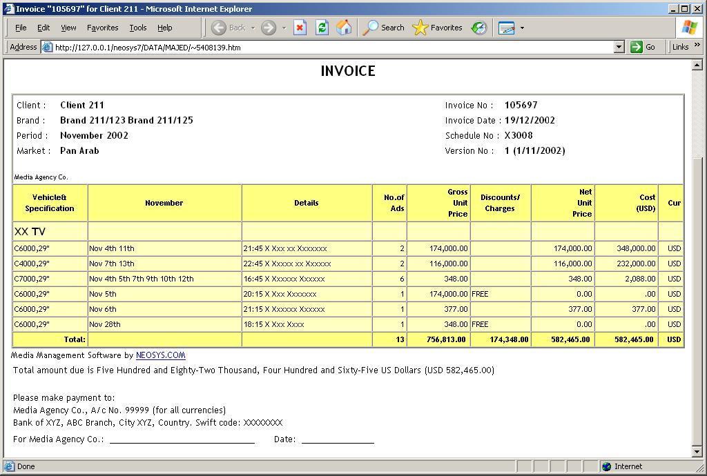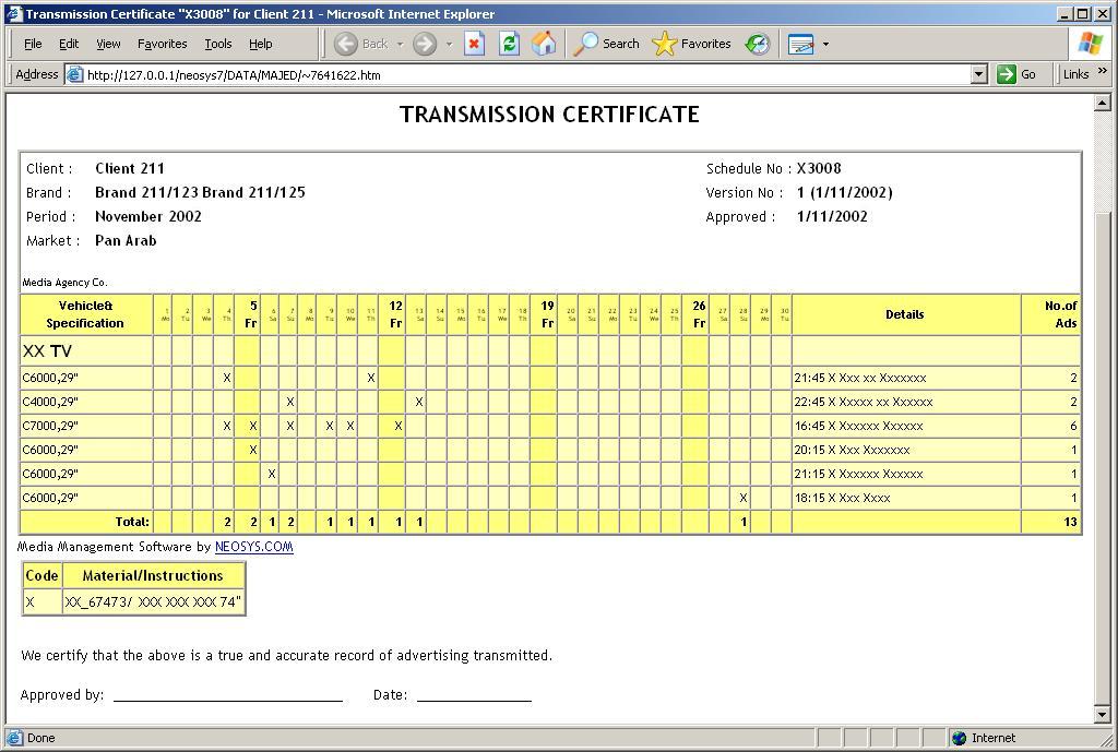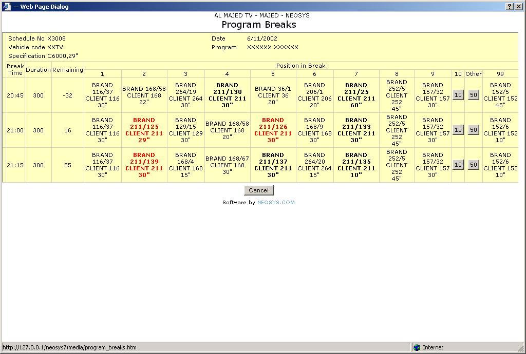 The exact positioning of the ads within a specific break within a specific program can either be done at the time of accepting the clients order or at any time up to the production of the Broadcast Order to the station. The system warns if there are conflicting products in the same break and if total duration of the ads exceeds the nominal maximum break time.