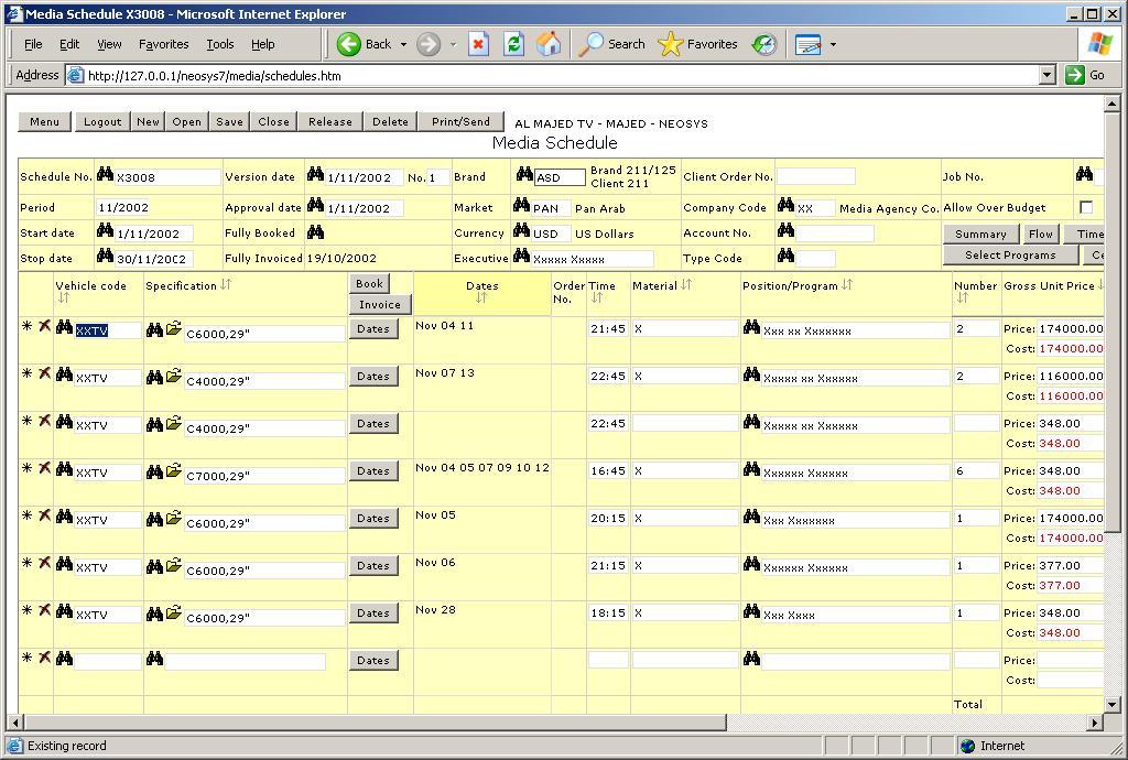 This is where a clients order is initially entered. Its nice to be able to see a complete overview of the whole order. Allowing repetitive ads on one line saves a lot of time too. Exact positioning of ads within breaks is done on a later screen.